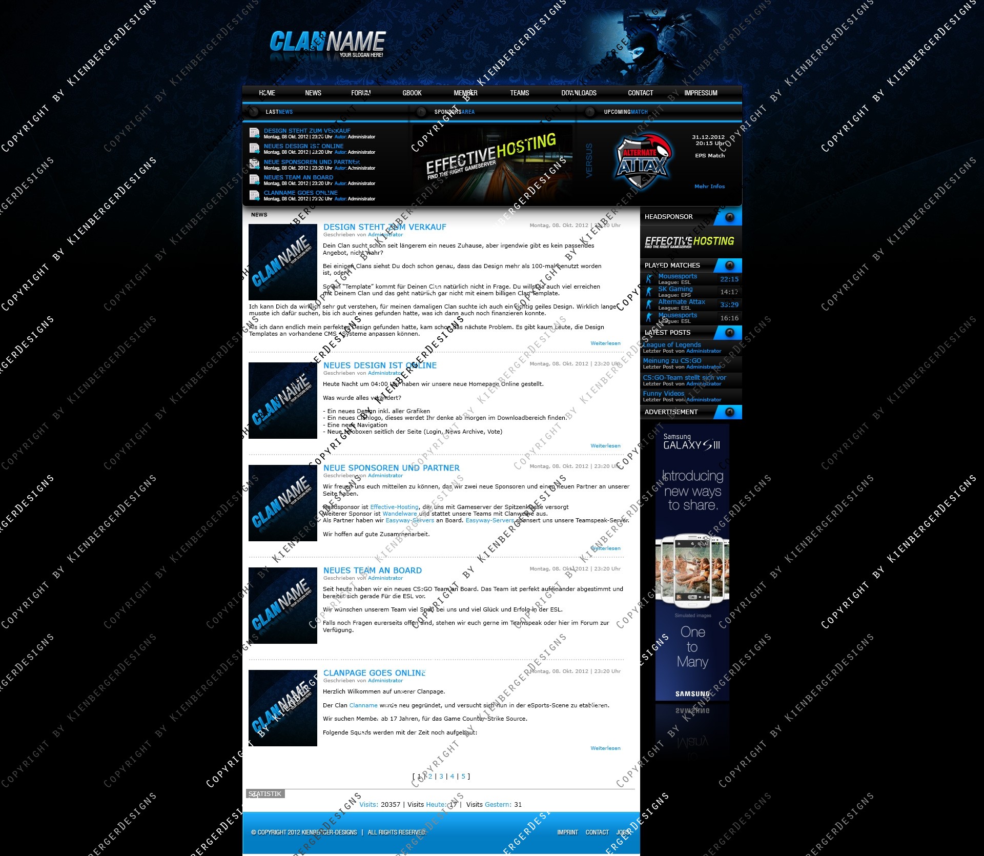 ich biete hier ein frisches, hochwertiges Clandesign in modernen Farben an. Das Design lässt sich einfach slicen und aufgrund des simplen Aufbaus leicht an gängige CMS Systeme wie Webspell und DZCP anpassen. Das Design lässt sich eigenhändig mit allen gängigen Photoshop Version bearbeiten.
