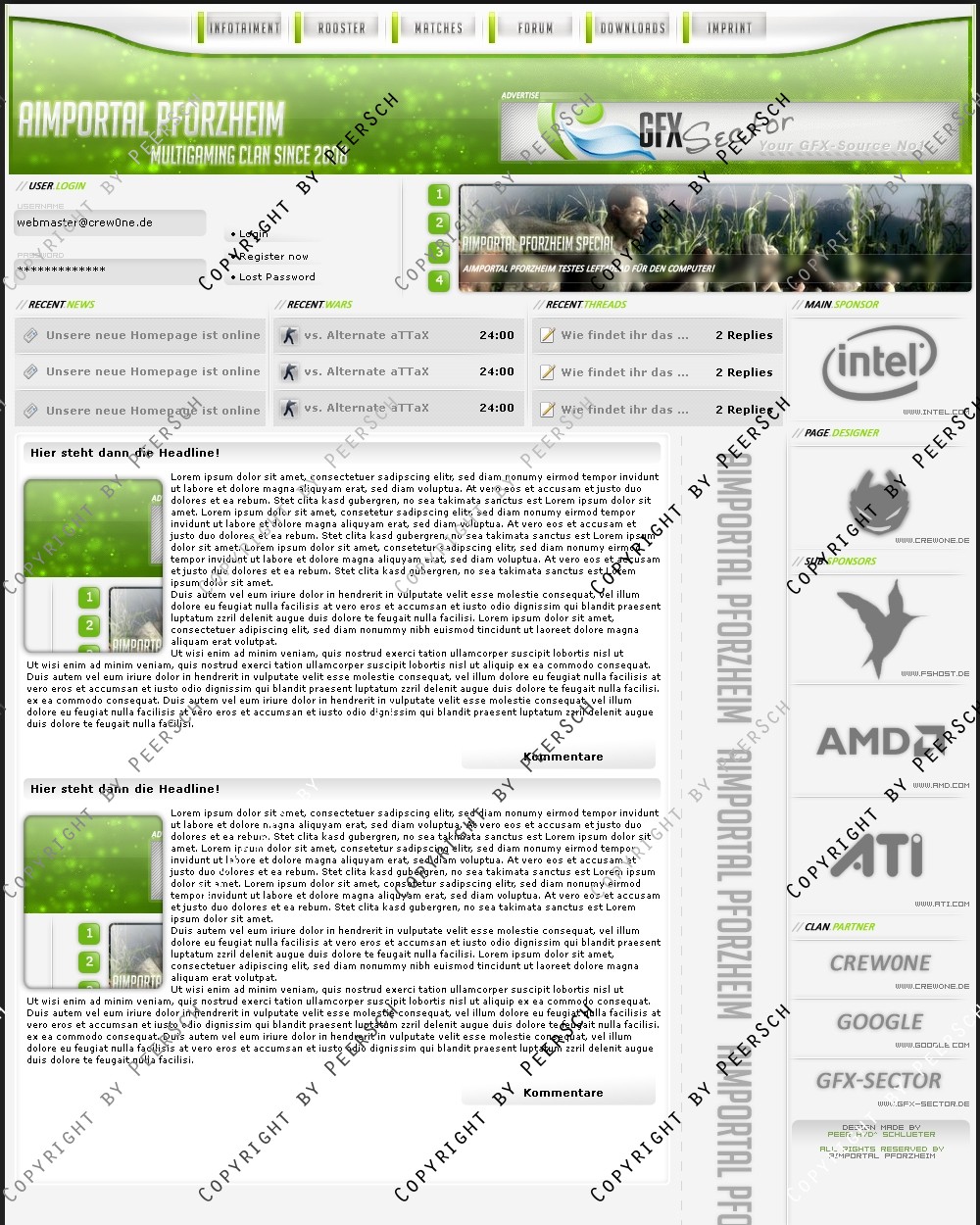 Zu einem meiner Meinung nach unschlagbaren Preis! Was Sie hier kaufen ist lediglich die PSD Datei, gerne kann ich es Ihnen gegen einen Aufpreis von 12,50€ an ein CMS Anpassen, zur Auswahl stehen hierbei: webSPELL, Clansphere, Teklab, Devilz und andere CMS auf Anfrage ohne Aufpreis.