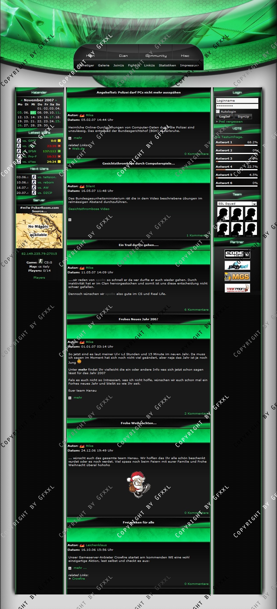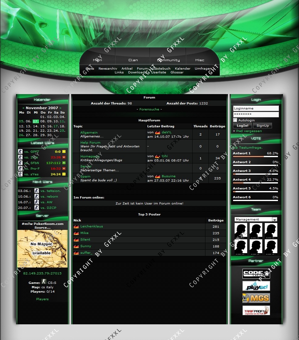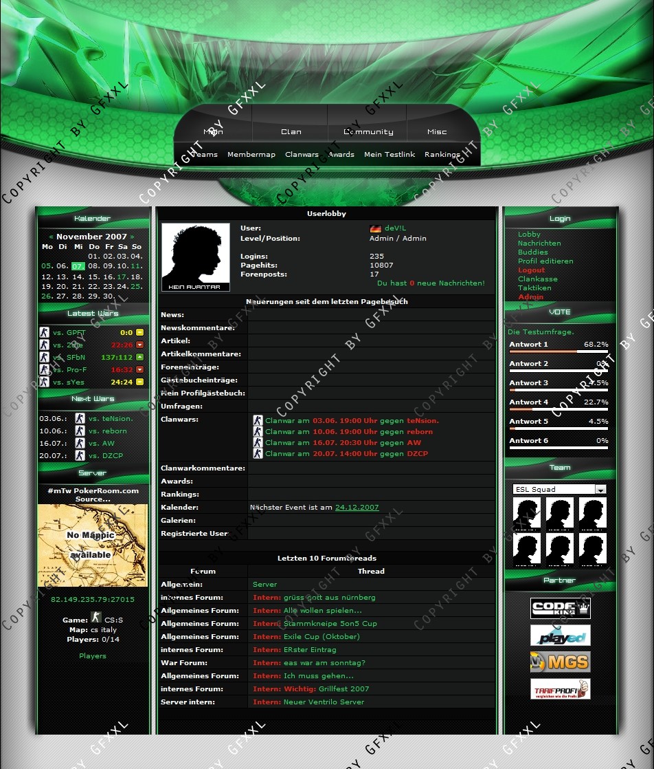 Wir sind mit unserem Templete von ClanDesigns.org und CodeKing.eu voll und ganz zufrieden. Alle unsere Änderungswünsche sind sehr gut gelungen und die Installation war ein Kinderspiel. Der Support ist genial schnell, freundlich und echt nicht aus der Ruhe zu bringen :-) Super schnelle und gute Lösung für jeden Clan der sich von der Masse abheben will.