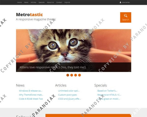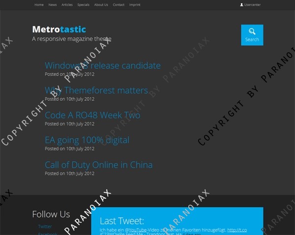 Metrotastic is a responsive HTML5 / CSS3 Theme for WordPress. It is based on Twitter’s Bootstrap Framework – Enhanced with jQuery and custom post types. It’s designed with online magazines in mind and comes with a light and dark color scheme and unlimited color options. It looks fantastic on mobile devices, is easy to setup and has some amazing CSS3 and jQuery effects. Everything right out of the box. So what are you waiting for?