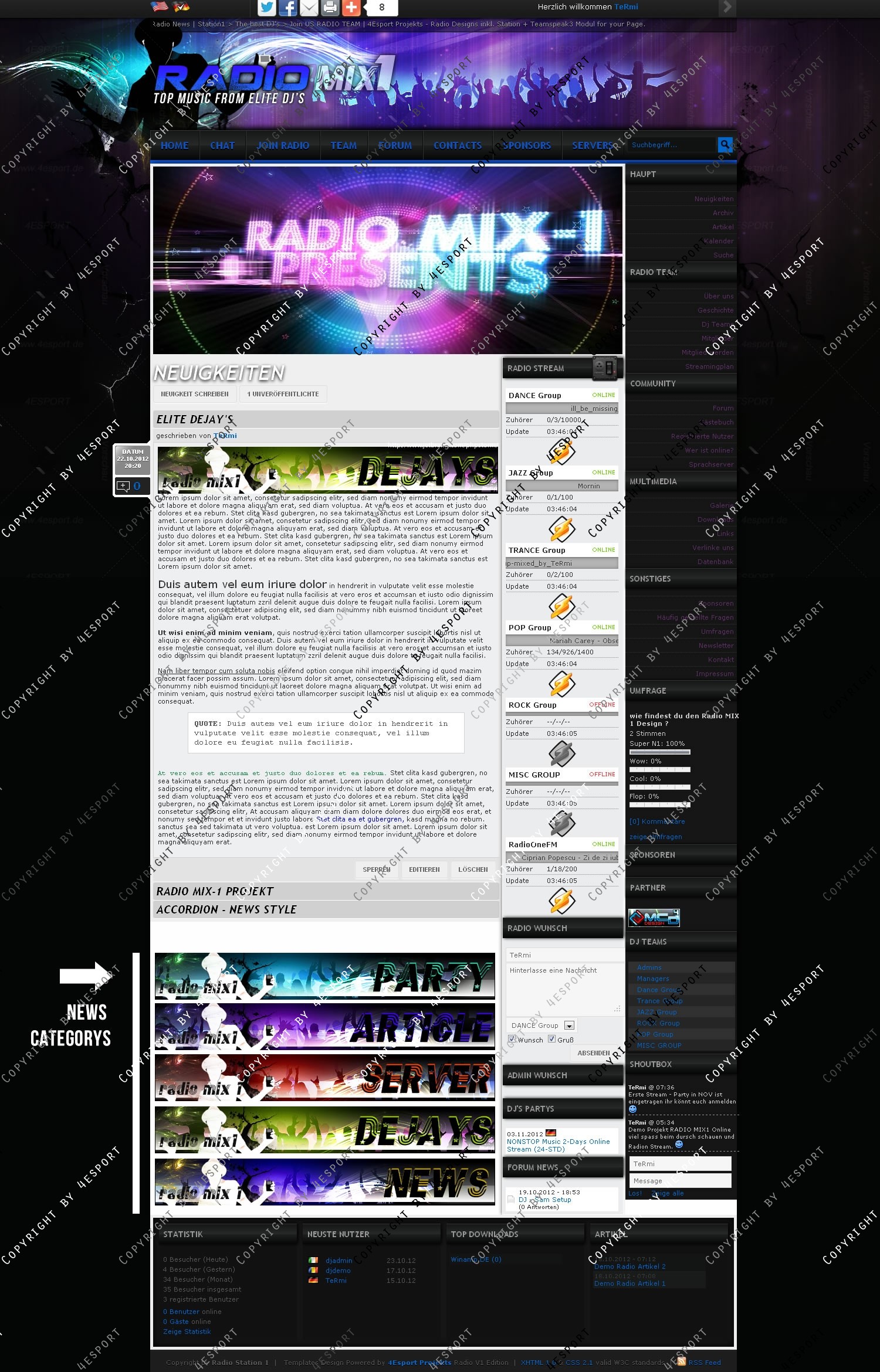 Sie erhalten hier eine Professionelle Radio Homepage: Inkl. Module: DJ - Login, Neu Registrierung, News, Archiv, Artikels, Kalender, RADIO-über uns, RADIO-Geschichte, DJ-Teams mit eigener Profil Darstellung und Klapp Modus in mehreren Gruppen aufgeteilt inkl (DJ, Galerien, Freunde Liste, Letzte 10 Beiträge im Forum und persönliche Gästebuch), Homepage Mitglieder–liste, DJ-Mitglied werden (Formular), Streaming Plan für DJs inkl. ON AIR Modul anzeige auf die STARTSEITE/LANDING PAGE, Community Module wie: Suche, Gästebuch, Forum, Foto – Galerie, Sprach (Voiceserver z.B. TS2/TS3) Server, Downloads, Links, Link-AS-Banners für Radio inkl. 5Banner PSD, FAQ, Wer ist Online + Statistik Box, Newsletter, Kontakt + individuelle Impressum Darstellung, Boxen MODULE sind über die ADMINISTRATION leicht zu editieren: Titel von Boxen, sichtbar Modus: die Boxen an oder aus stellen einfach per KLICK J
